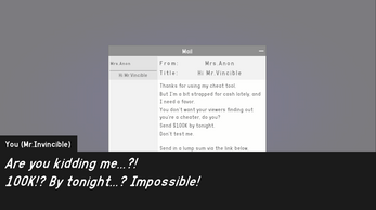 One day, you receive an email from the developer of the cheat tool you use. She threatens to expose your cheating unless you pay her 100,000 dollars.